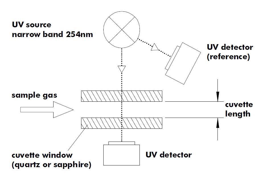 紫外線輻射由兩個不同的紫外線探測器測量。一個探測器稱為參考探測器,測量通過比管前的輻射,另一個探測器測量通過比管后的輻射,以及通過比管中包含的樣品氣體的輻射。